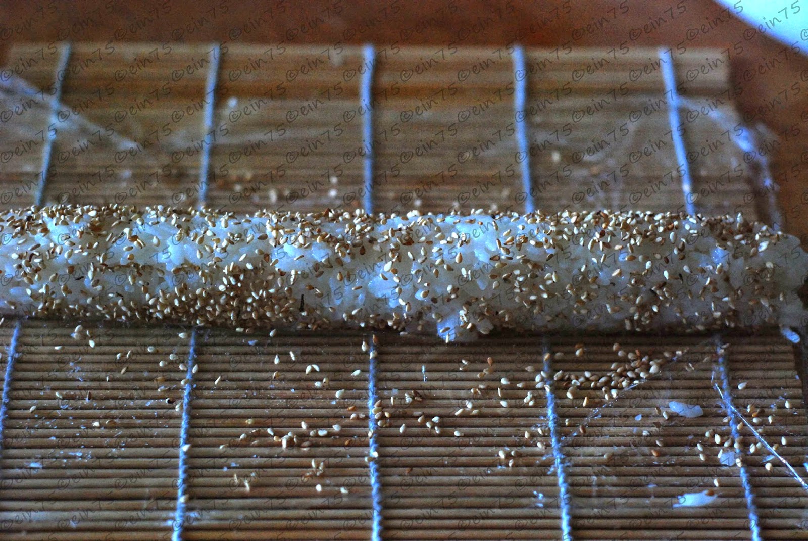 Cuando tengamos hecho el rollo, no sabemos como pegarlo para que no se desmonte, así que nos mojaremos los dedos con agua y unimos mojando el final del alga con el alga del rollo.